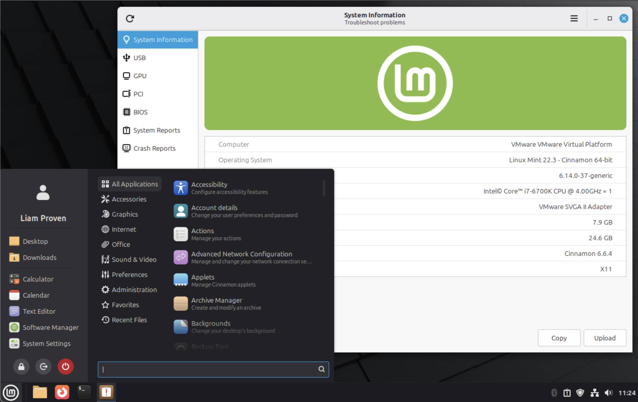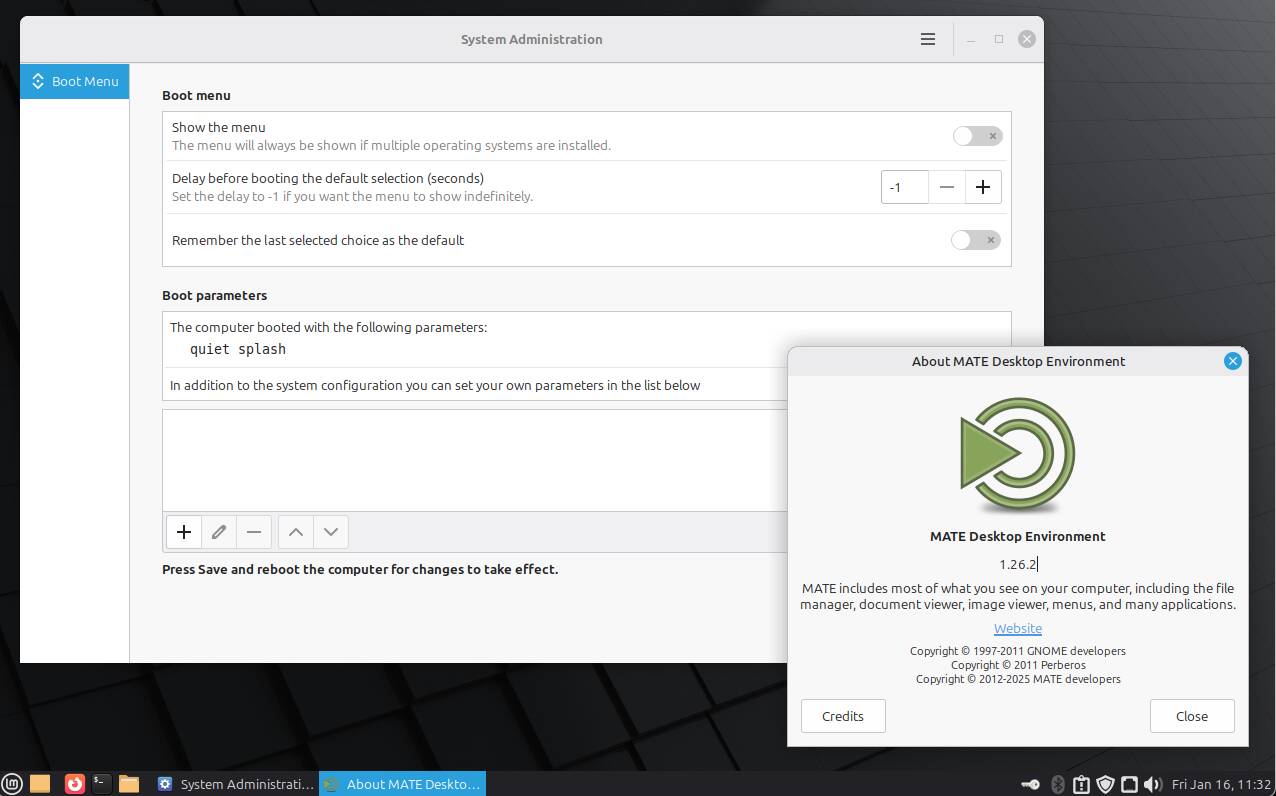 Помимо менее заметных внутренних обновлений, появились новые функции, затрагивающие Cinnamon, MATE и Xfce. Старый инструмент System Reports (Отчёты системы) получил новые страницы для предоставления информации об USB-устройствах, графических процессорах, устройствах PCI и системной прошивке; в связи с этим он был переименован в System Information (Информация о системе). Также появился новый, очень похожий по виду, но требующий прав root, отдельный инструмент под названием System Administration (Администрирование системы). Пока он содержит только одну страницу, позволяющую легко настраивать различные аспекты конфигурации загрузчика и меню через удобный графический интерфейс. Это долгожданное изменение, поскольку этот аспект игнорируется почти всеми другими дистрибутивами. Добавлена и новая апплетина для управления устройствами Thunderbolt. Мы уже сообщали о несовместимости между Thunderbolt 4 и более старыми версиями, и даже простое приложение, способное сообщить, что видит и как идентифицирует компьютер, очень полезно — и отсутствует в некоторых дистрибутивах и рабочих средах.