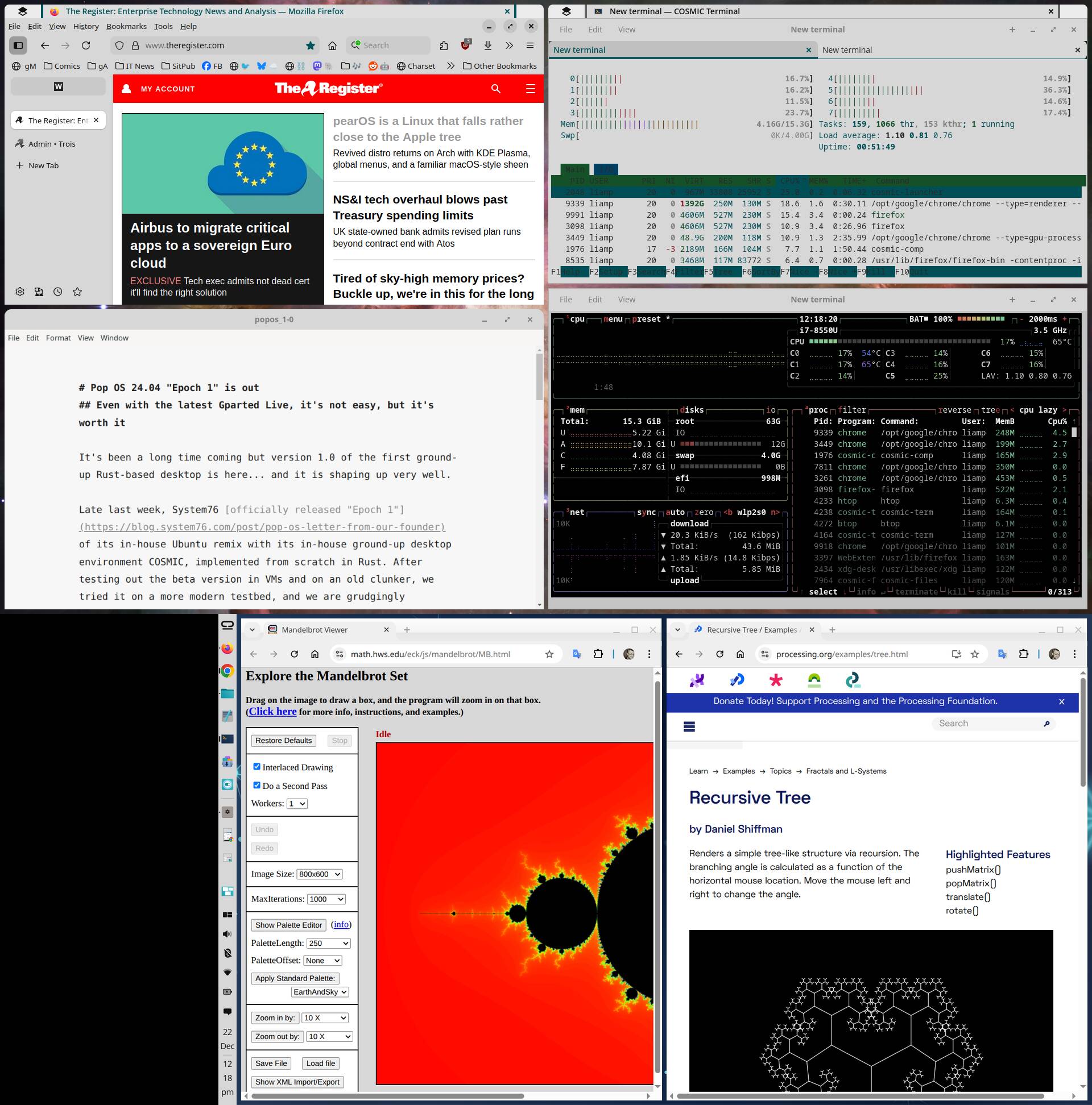 Разработка десктопной среды COSMIC заняла немало времени, ведь создание совершенно новой среды — задача нетривиальная. Издание The Register впервые сообщило об этом проекте чуть более четырех лет назад. Мы рассматривали альфа-версию в сентябре, а затем и бета-версию. Теперь, как и было обещано на Ubuntu Summit в прошлом месяце, вышла версия 1.0 десктопной среды COSMIC, а также её родной дистрибутив Pop!_OS 24.04 на базе Ubuntu Noble.