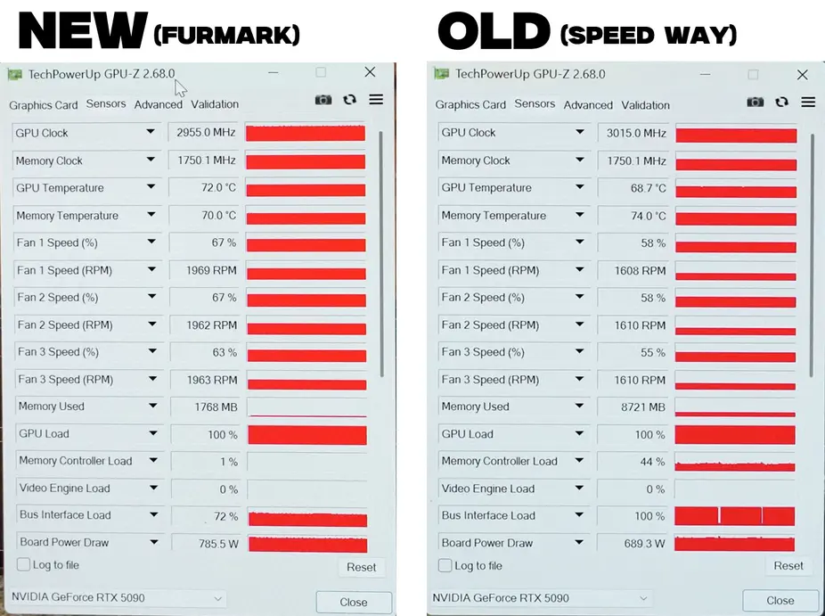Согласно тестированию в FurMark, новая карта потребляла почти 800 Вт, при этом коннекторы 12V-2×6 и ASUS HPWR потребляли почти по 350-450 Вт каждый, что гарантирует более прохладную работу коннектора. Температура графического процессора при полной нагрузке достигла почти 70-72°C, что показывает небольшое улучшение по сравнению с предыдущим образцом. Ранее тестирование проводилось в Speed Way при потреблении около 700 Вт, и температура оставалась в диапазоне 67-69°C. Это не прямое сравнение, но в целом графический процессор теперь, похоже, демонстрирует несколько лучшую тепловую производительность.